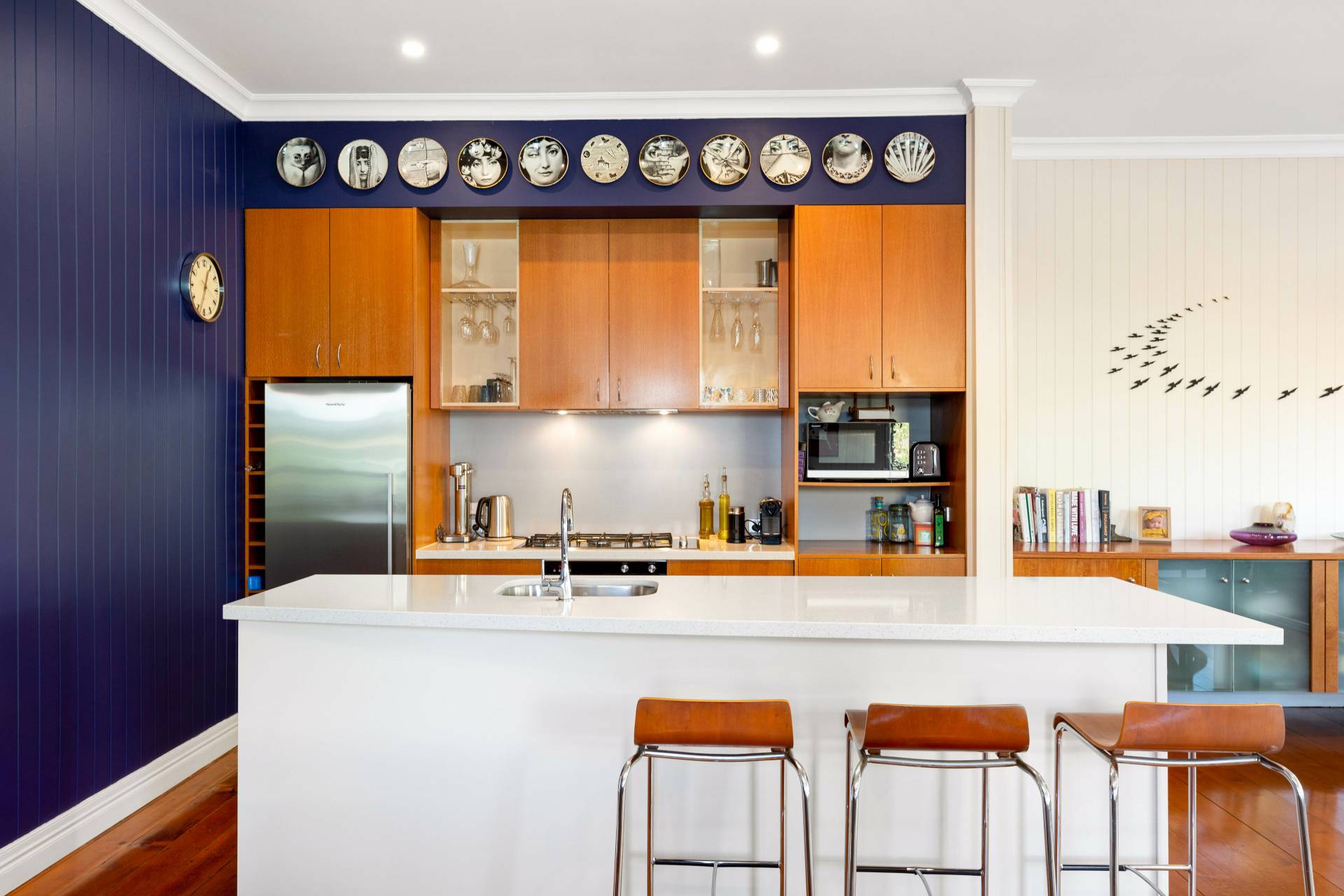 • Well appointed, practical kitchen featuring Fisher Paykel appliances including the 900mm wide 5 burner gas cooktop, pyrolytic oven and dishwasher. Other features include engineered stone benchtops, appliance recess, wine rack plus ample cupboard, drawer and bench top space.