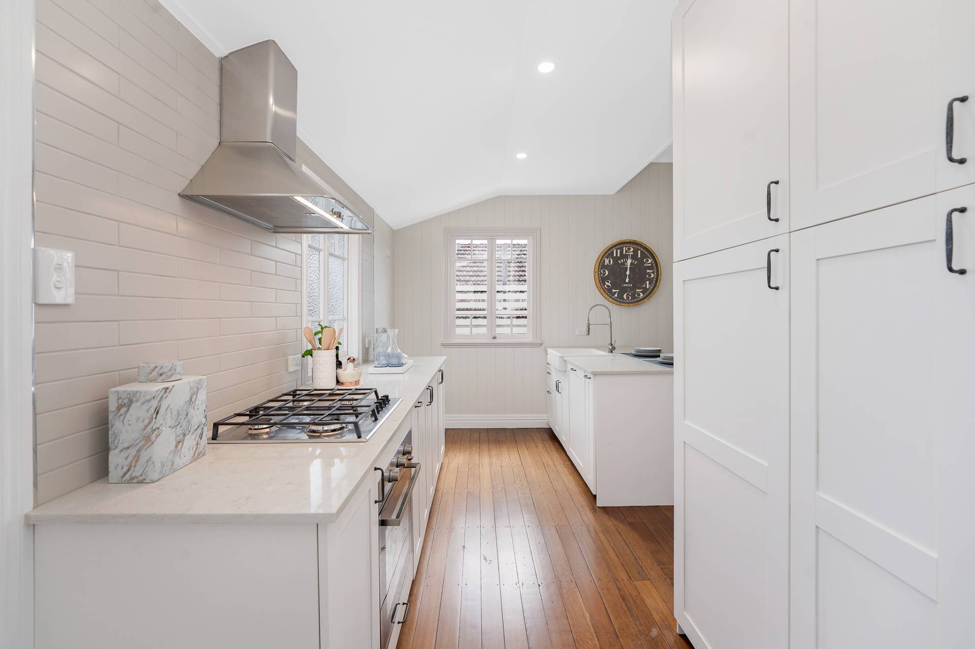 Brand NEW kitchen with stone bench tops, shaker style cabinetry, gas stove top cooking with electric oven, huge pantry plus ample cupboard and drawer space