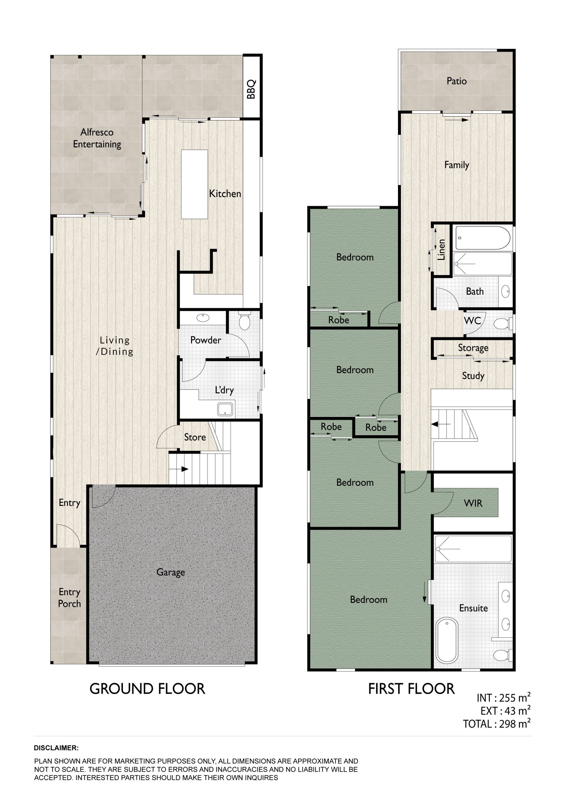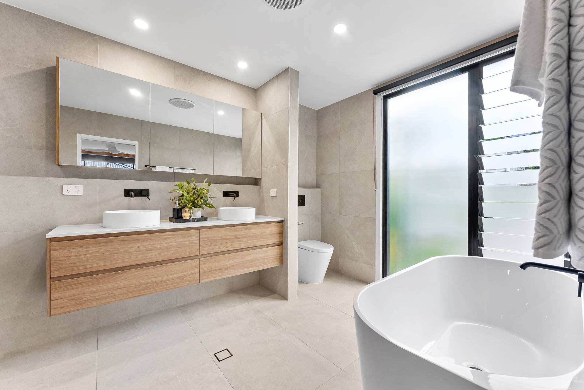 • The Master Suite boasts a striking Bamboo feature wall, spacious ensuite with floor to ceiling tiles, large wall hung vanity, deep soothing bath and twin shower. Plenty of room for all your clothes in the fitted walk in wardrobe