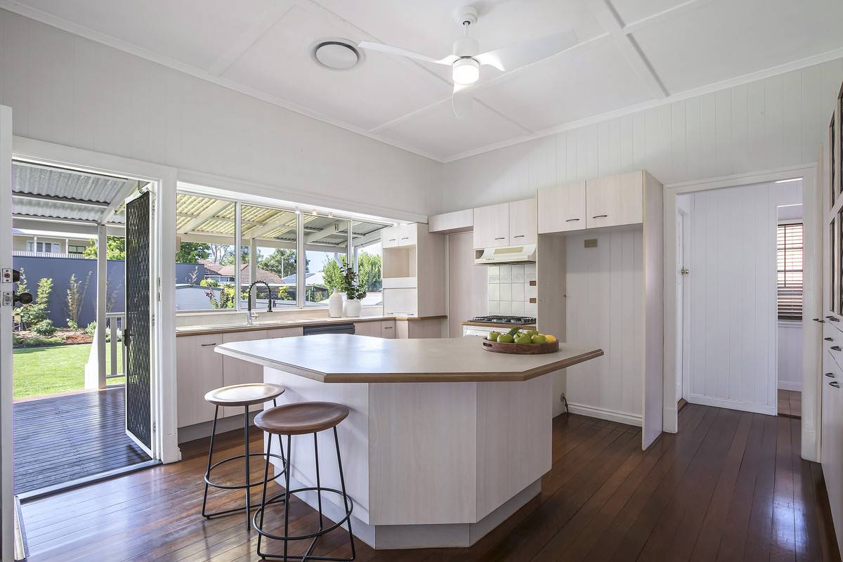 cupboard and bench space. The kitchen features a servery style opening to the deck