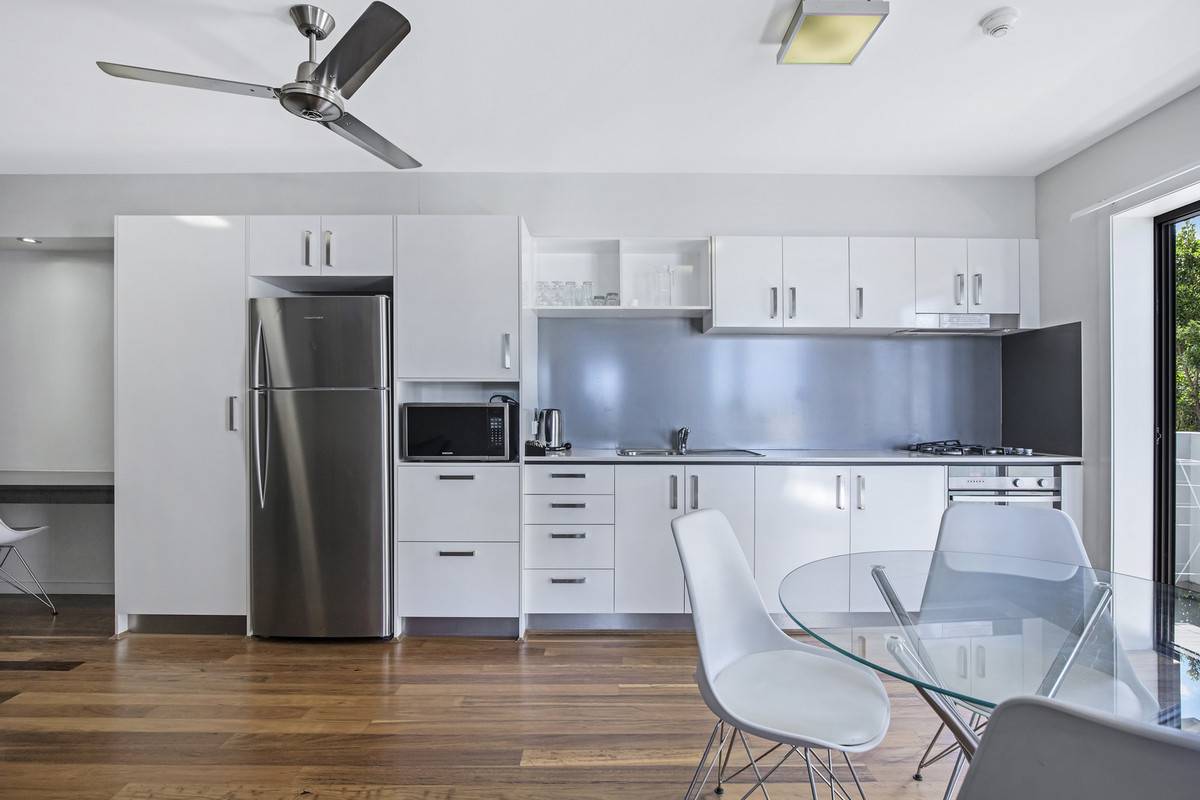 microwave, 4 burner gas cook top, plus ample cupboard and bench space.