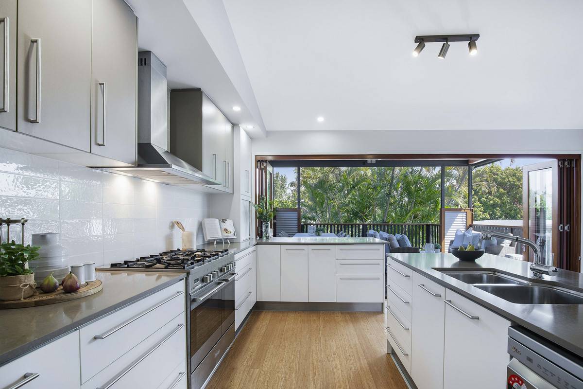 • A well-designed kitchen featuring stone benchtops, Delonghi 900mm 5 burner gas