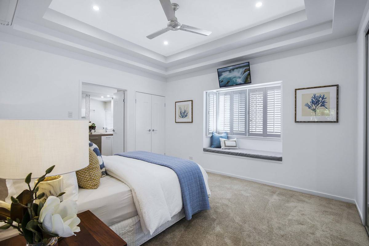 carpet, ceiling fan and classic bay window dressed in white shutters. The ensuite