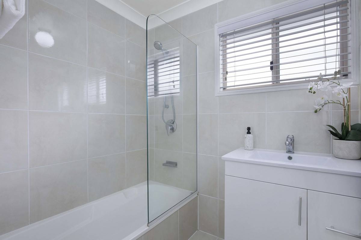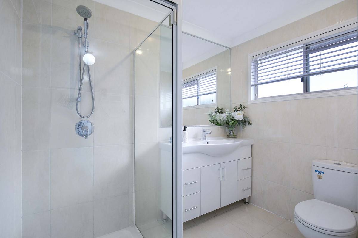 • Neat and tidy bathroom with shower, vanity and toilet.